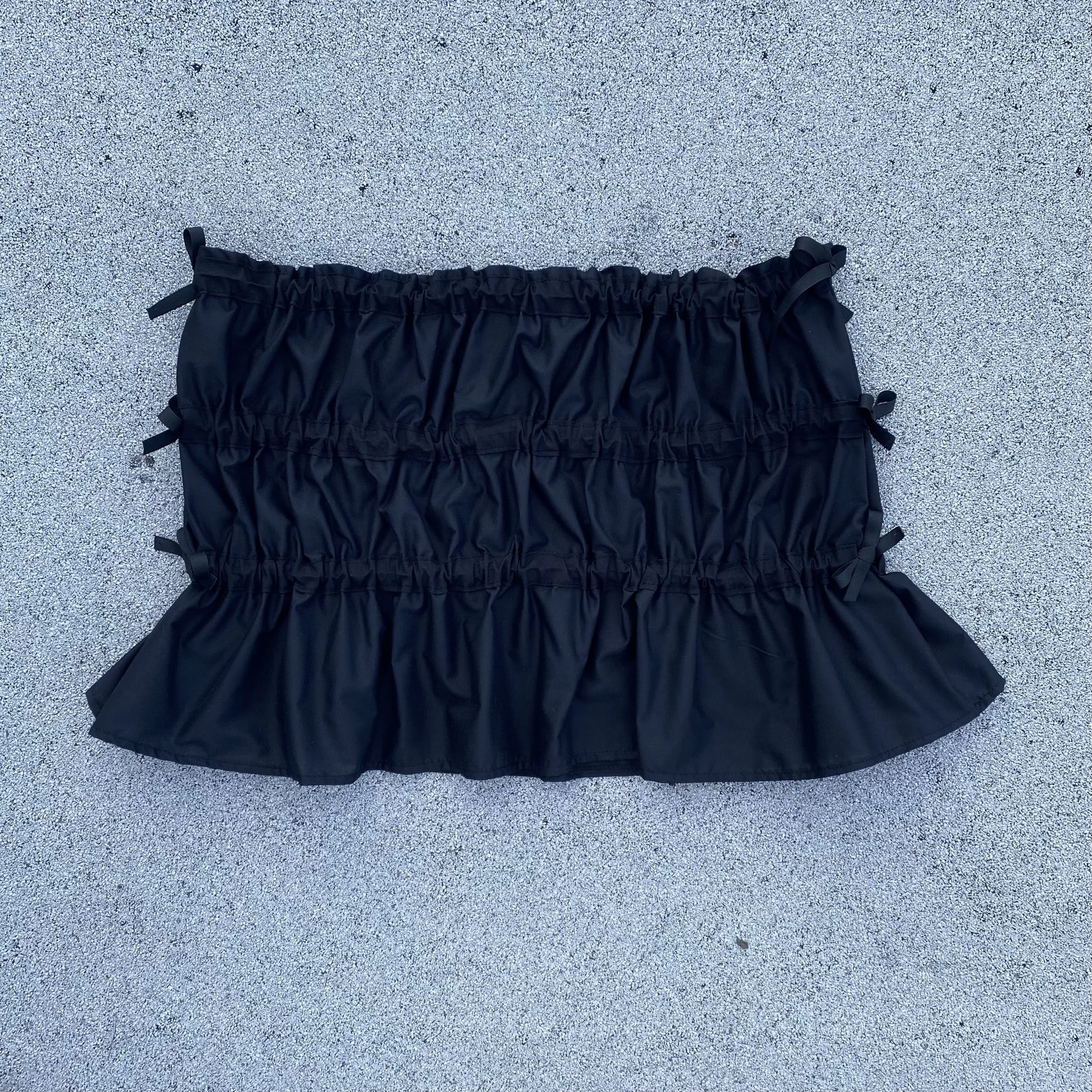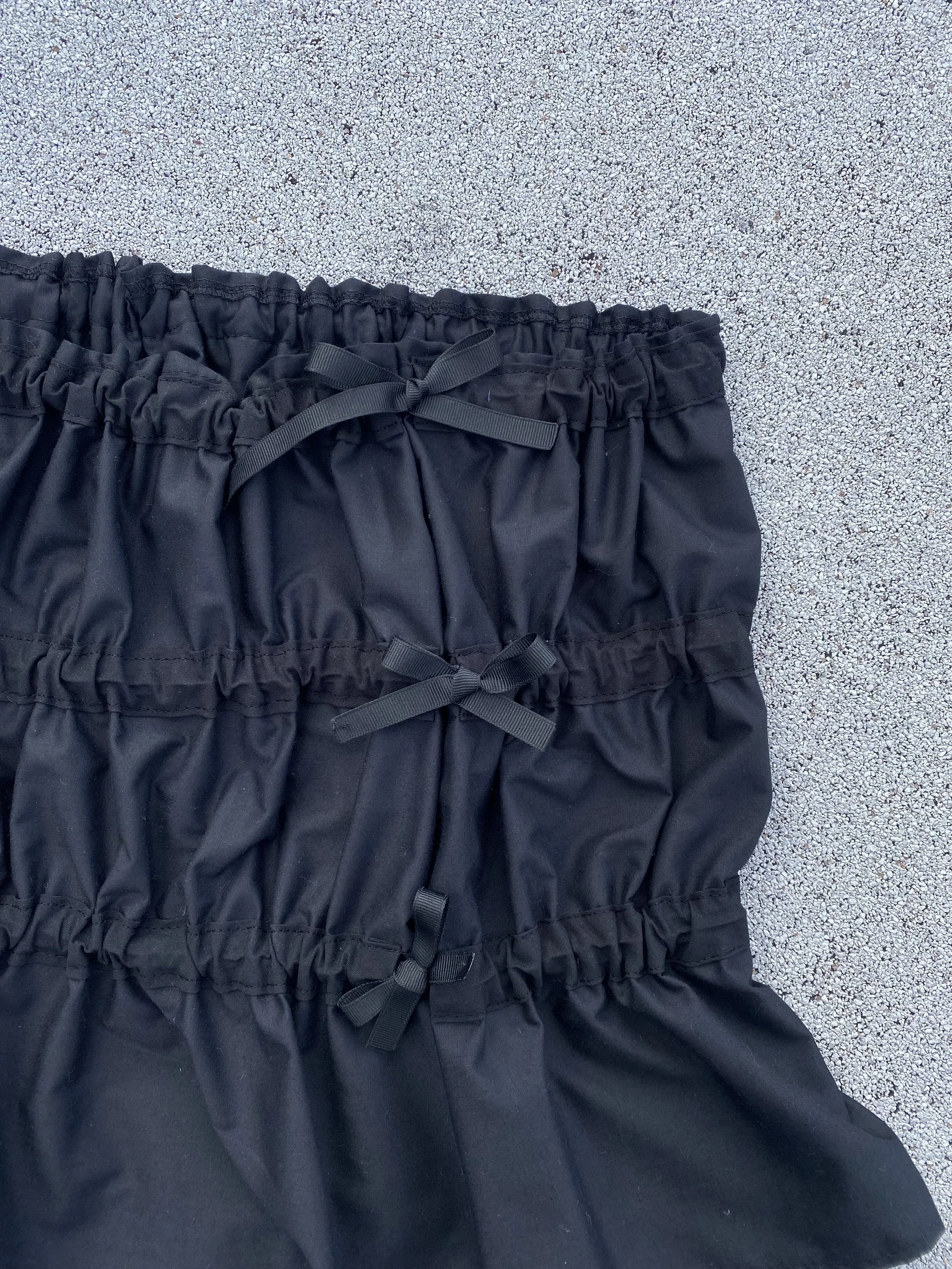 Cotton skirt with 3 tiered gathering elastic ties on the side seams.